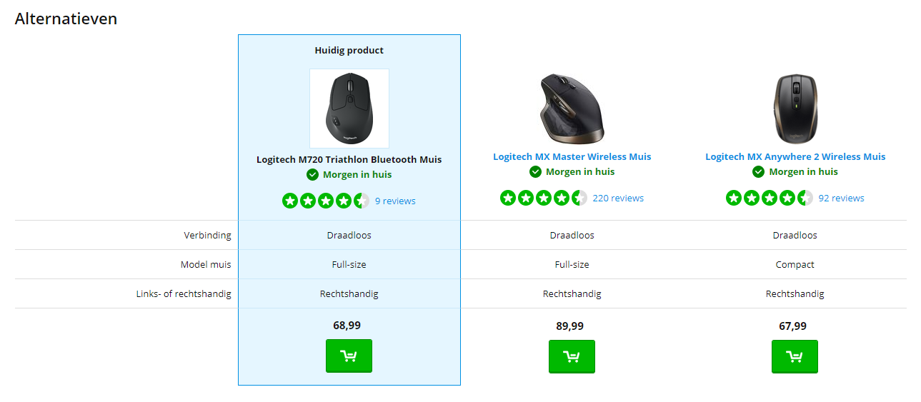 - Alternatieven: Om er zeker van te zijn dat klanten de juiste keuze maken wil je ze natuurlijk eerst laten zien welke alternatieven er zijn. Daarom heeft Coolblue onderaan de productpagina altijd een paar alternatieve producten staan die passen bij de specificaties en prijsklasse van het door jou gekozen product.