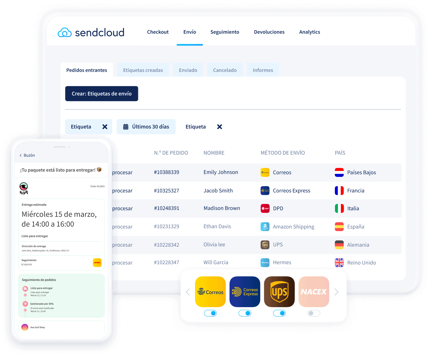 Automatiza la creación de etiquetas, los emails de seguimiento, las devoluciones y mucho más. Llega a clientes de todo el mundo y mejora su experiencia de entrega, desde el checkout hasta las devoluciones.